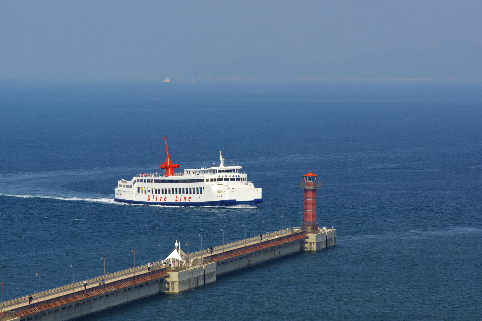 赤灯台は美しいガラスタイル出てきており、経路となる長い突堤は遊歩道として整備されています。夏は心地よい潮風に吹かれながら瀬戸内海国立公園を眺めての散歩となり、是非一度は体験してほしいものです。
